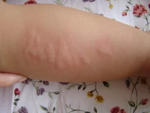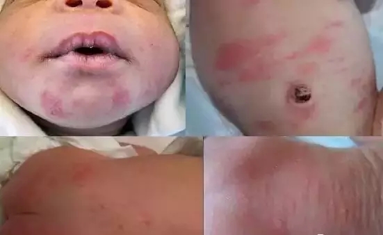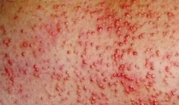 表現為水瘡和紅斑,伴有皮膚組織腫脹現象,很癢,抓撓后有黃色漿液滲出和出血。