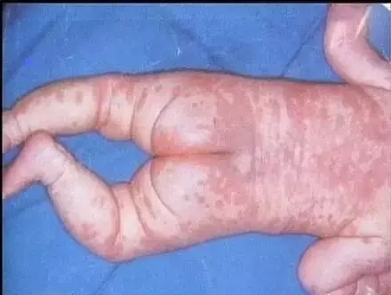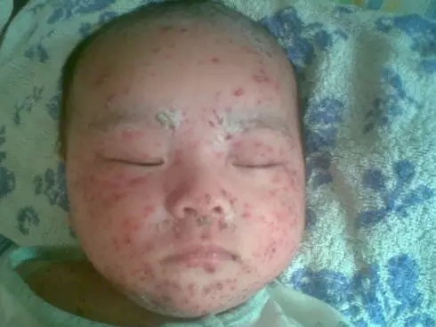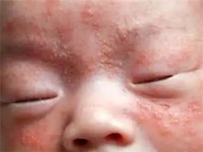 表現為皮膚潮紅,小斑丘疹上溢出淡黃色脂性液體覆蓋在皮疹上,以后結成較厚的黃色痂皮,不易除去,以頭頂及眉際、鼻旁、耳后多見,但是癢感不太明顯。